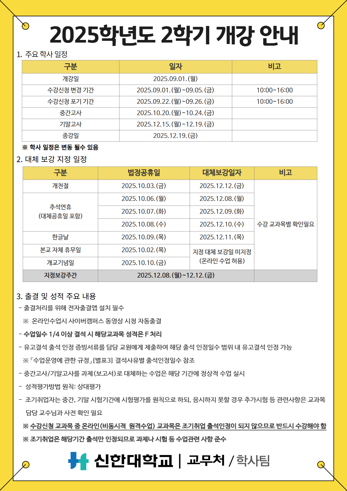 [학사팀/수업] 2025학년도 2학기 개강 관련 일정 안내