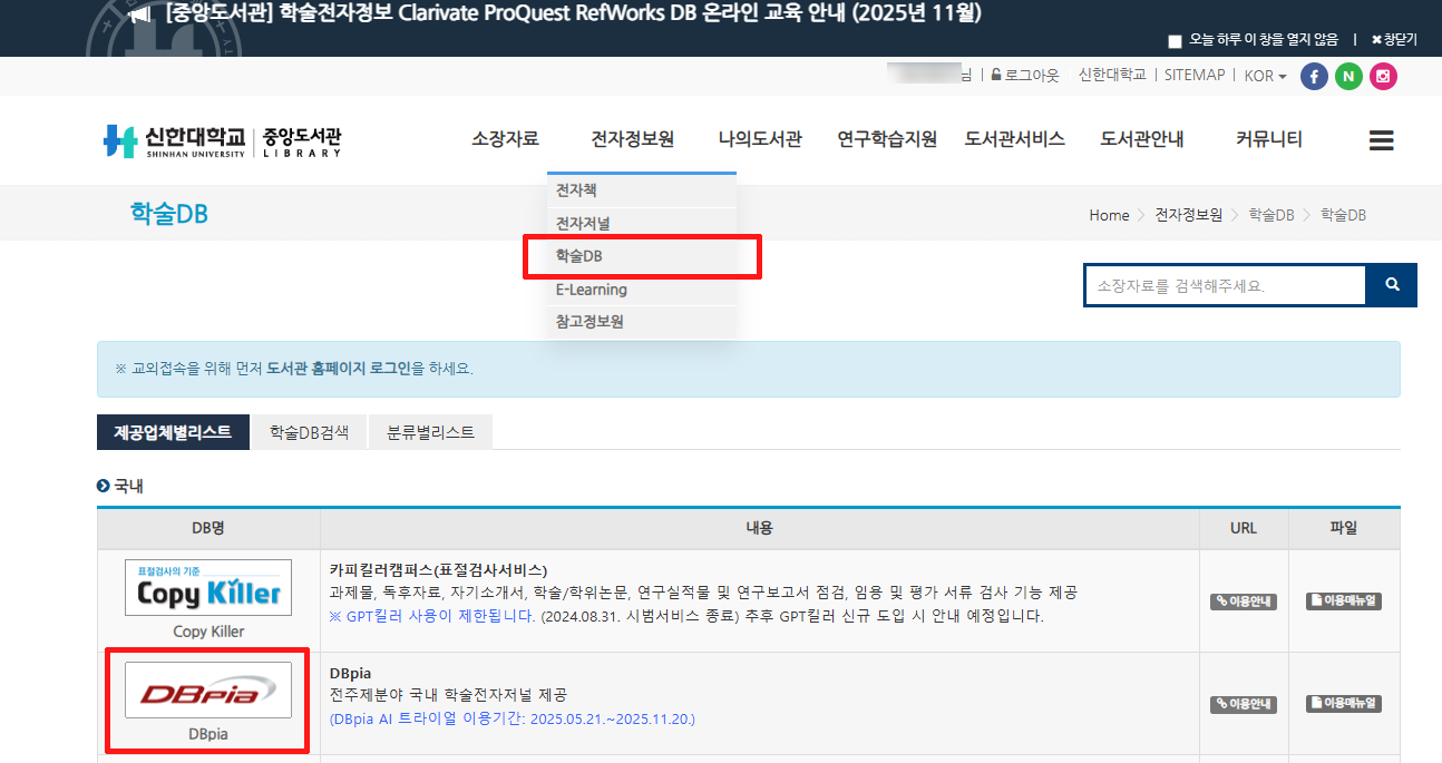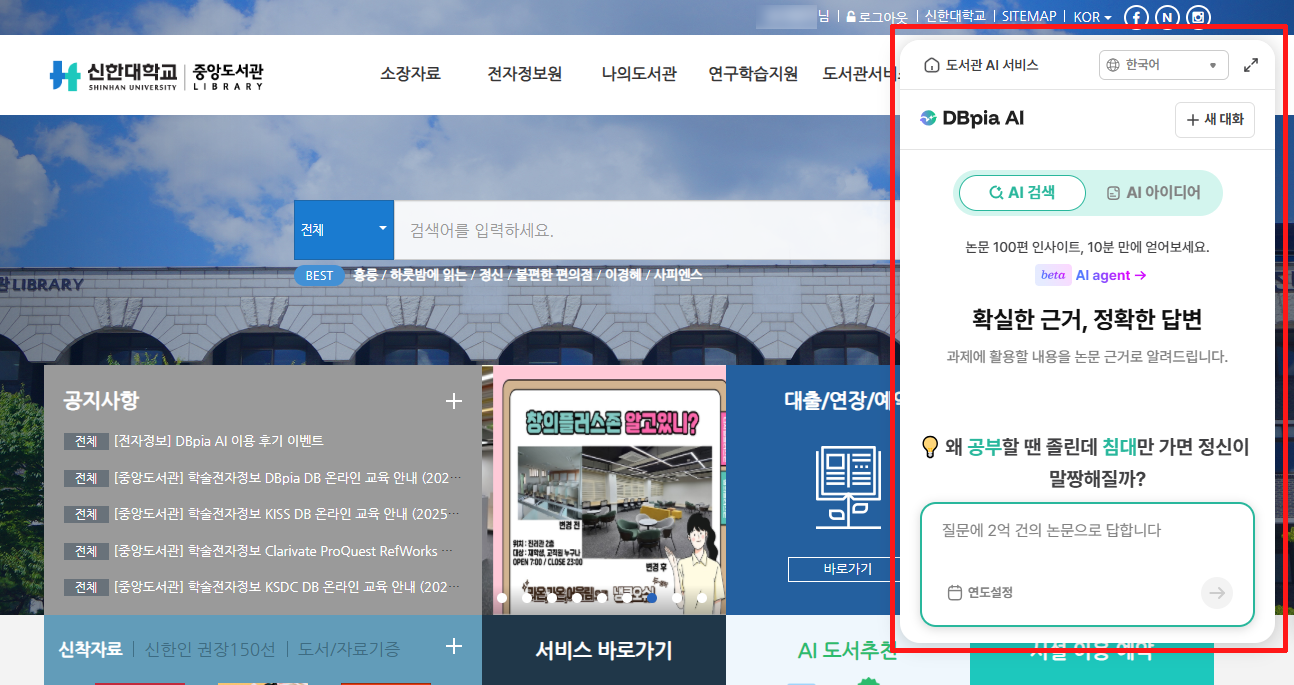 중앙도서관에서는 구성원의 학습과 학술연구 지원을 위해 신규 도입된 DBpia AI 서비스를 한시적으로 제공하고 있습니다.