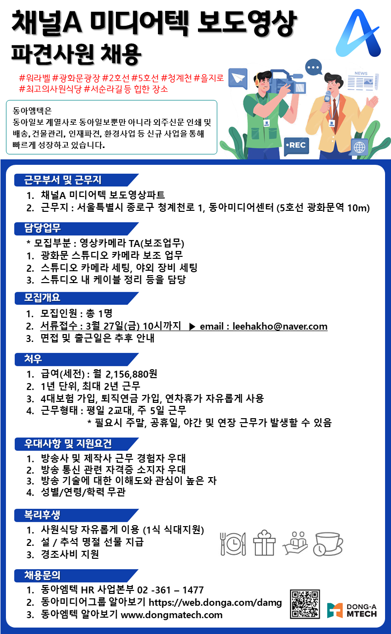 동아엠텍에서 채널A 미디어텍 보도영상 파견사용 채용을 실시합니다.