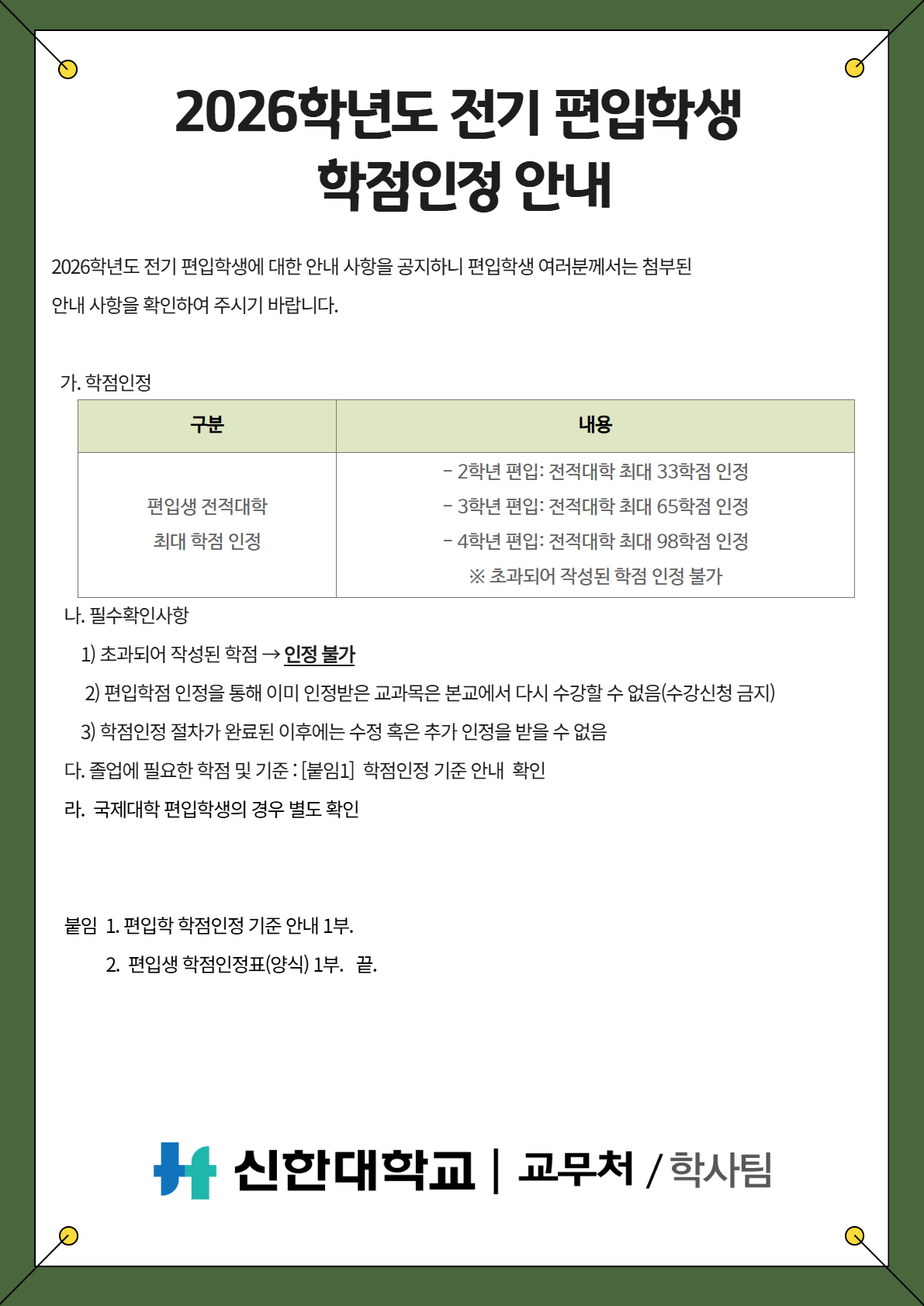 [교무처/학사팀] 2026학년도 전기 편입학생 학점인정 안내